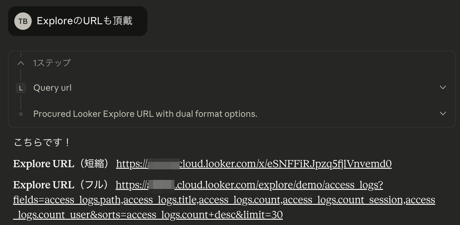 例えば、Dataform / dbt によるデータの整形加工プロセスの定義を確認することでより高い精度で項目の内容を把握できるかもしれませんし、分析外の話でも、ダッシュボード/ExploreのURLをチャットツールに投下したりとか、できることの範囲は大きく広がります。
