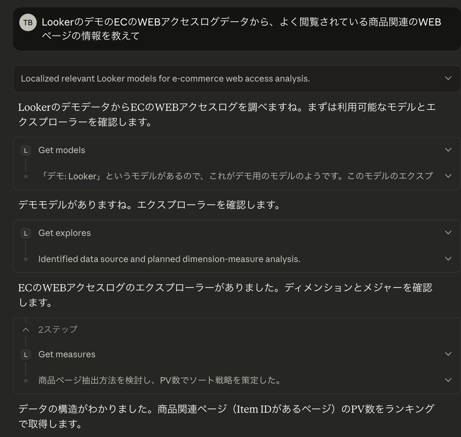 Lookerの強みである LookMLによるセマンティックレイヤーの活用 により、AIによる分析に際しての使用項目の選定の精度が高いです。
