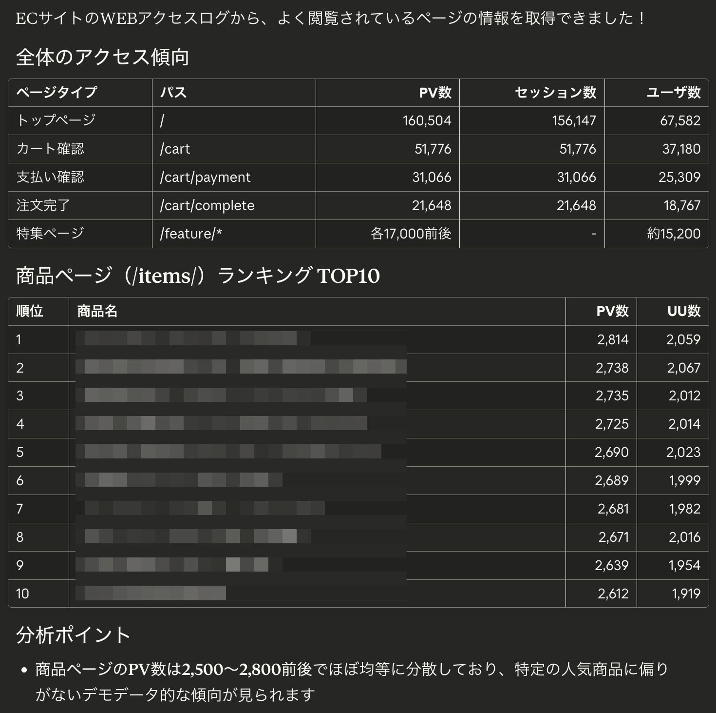 つまり、何か条件が漏れていたらこちらで修正を入れればいいですし、0から分析を開始するのに比べてとっかかりの叩きを作ってもらう、といった活用も十分にあり得ます。