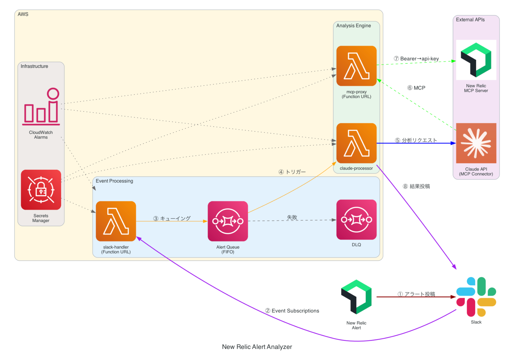 ローカルにアイコンの画像ファイルを配置し、プロンプトで指定する事でローカル画像もアーキテクチャ図に含める事が可能です。New Relicだったりのアイコンはデフォルトでは表示されませんでしたので、ローカル画像を指定しております。