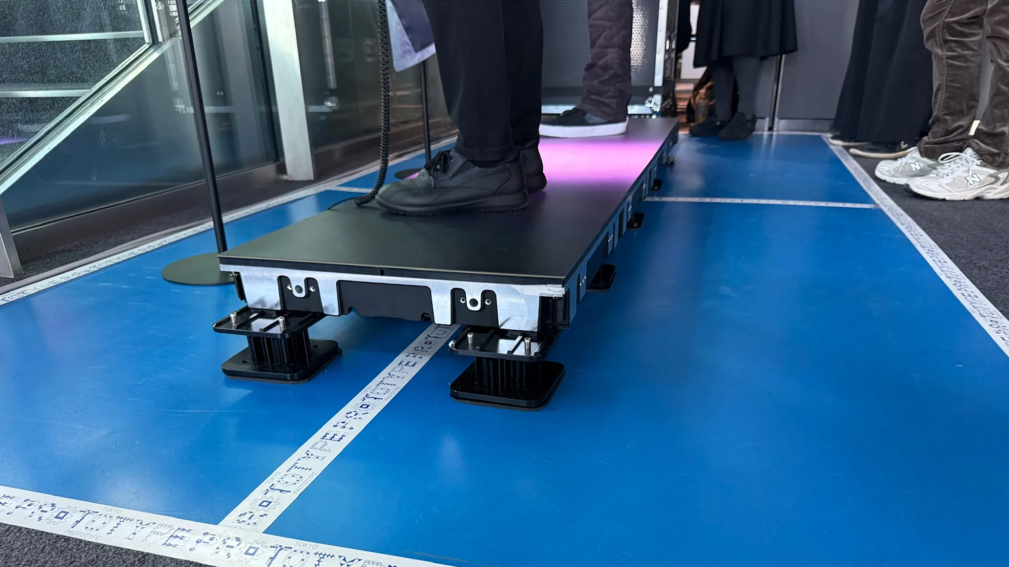 ヘッドホンを装着しディスプレイの上に立つと、このディスプレイが音に合わせて、映像と振動を用いて環境を再現する仕組みです。