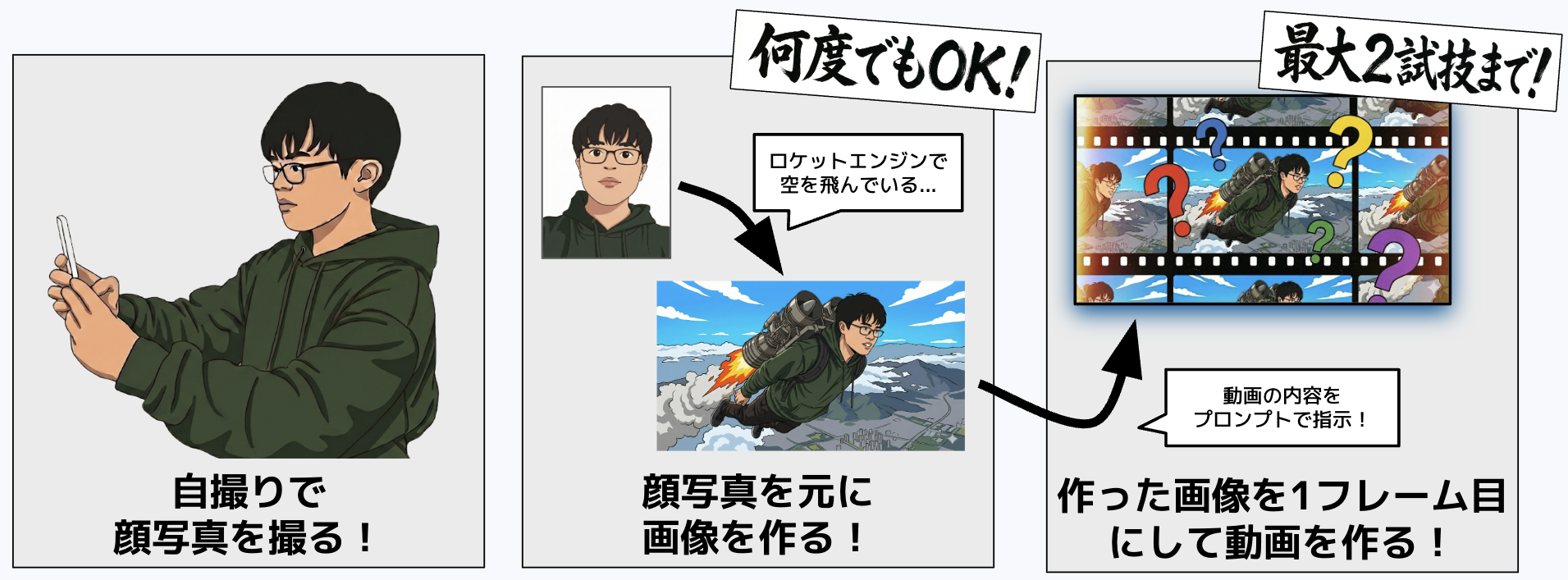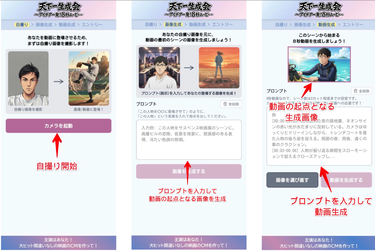 動画のテーマは 『あなたが主演!架空の映画のCMを作って』 、コンテスト参加者自身が登場する動画を生成してもらいます。エントリーするまでのざっくりとした流れは以下の図の通りです。