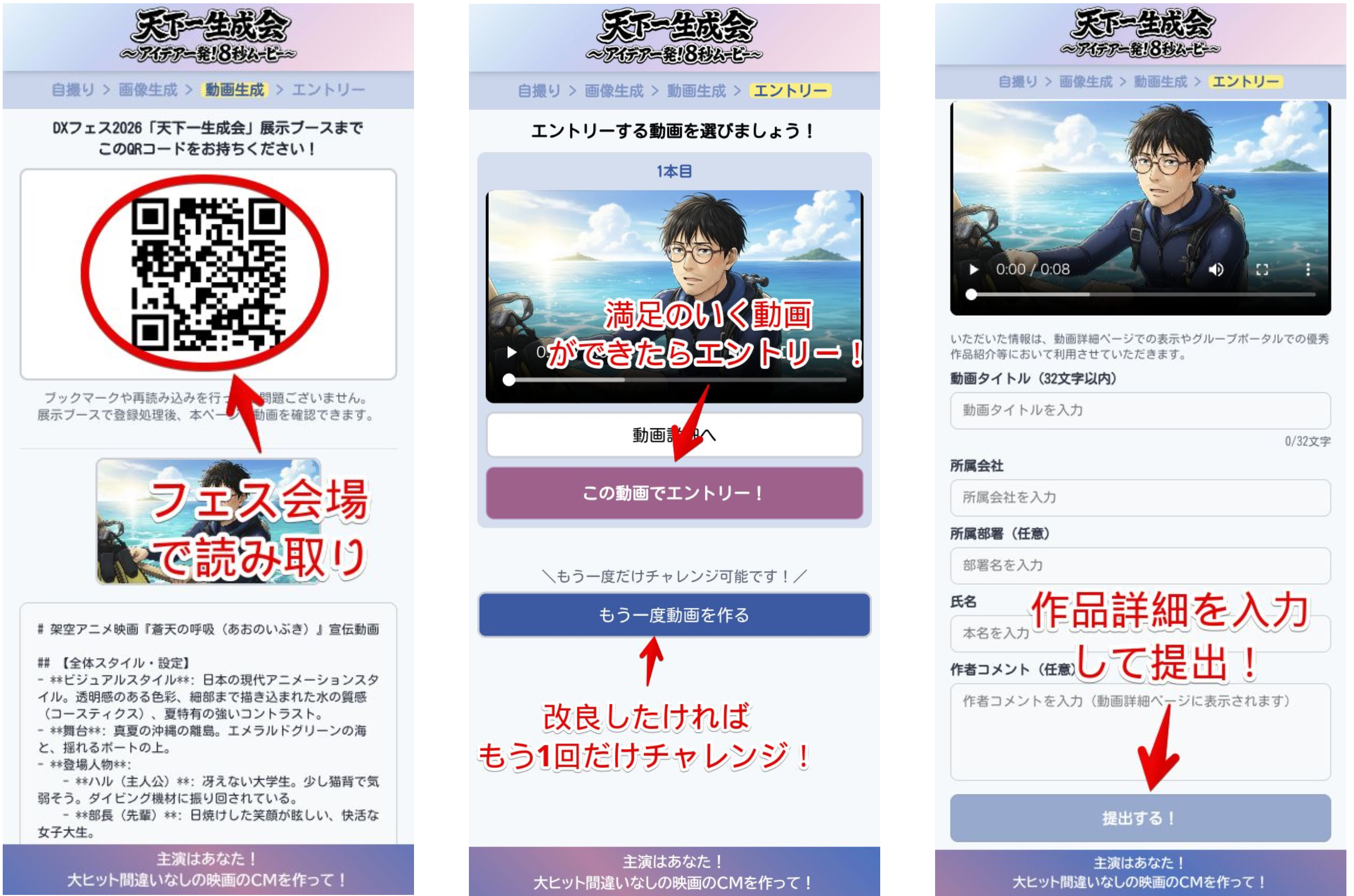 そんな生成 AI に焦点をあてて開催した『DXフェス2026』内では、上記記事内でも触れている通り、 “天下一生成会” と銘打ってショート動画コンテスト 🏆 を開催しました!その名の通り Google Veo3.1 を用いて生成した 8 秒の動画のクオリティを競うというものです。