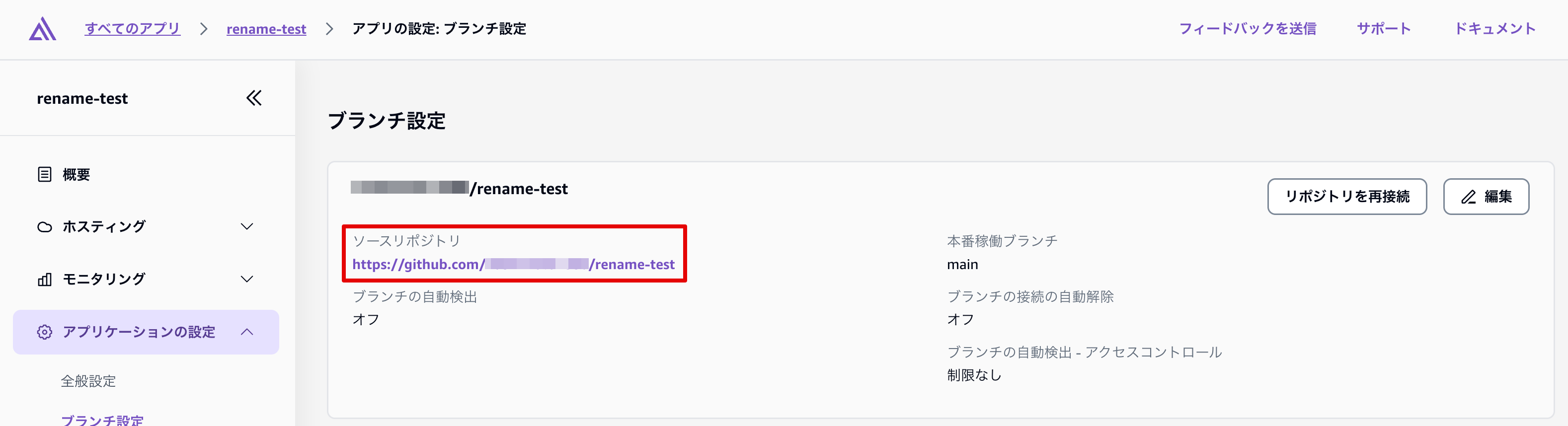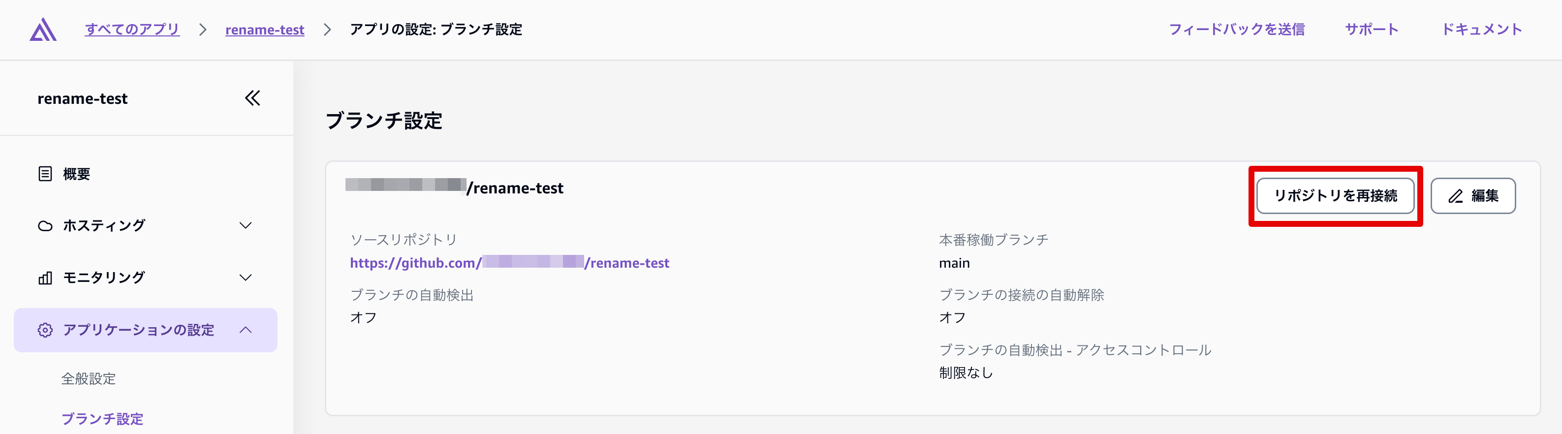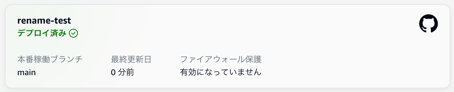今回は検証用に rename-testというリポジトリをAmplify上にデプロイしています。