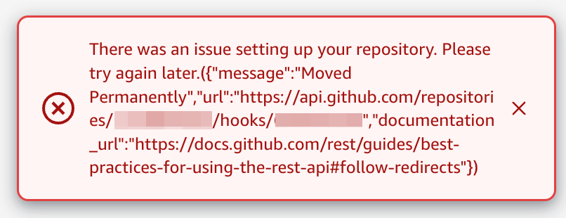 Amplify コンソール上に再接続ボタンがあったので押してみましたが、下記のエラーが出ました。